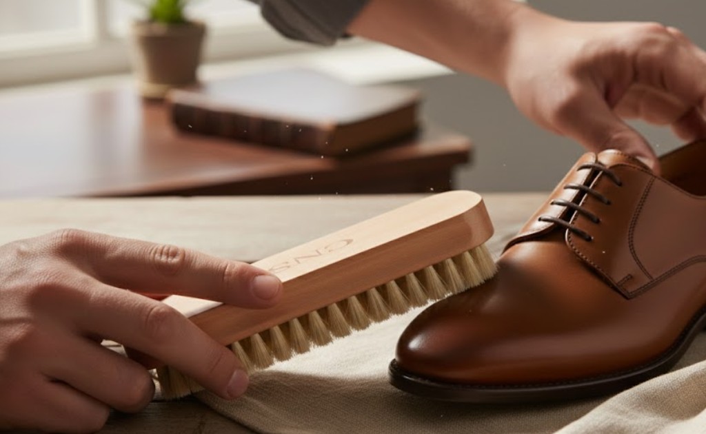 Polimento: Utilize a escova para polir os sapatos realizando movimentos circulares e constantes. Isso ajudará a remover o excesso de produto e a lustrar o couro uniformemente.